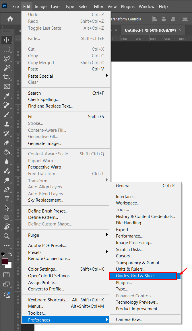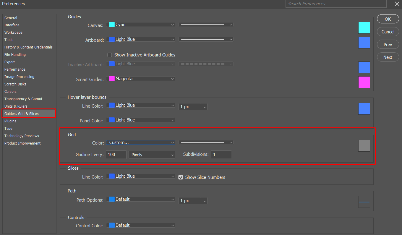 - Go to Photoshop > Preferences > Guides, Grid & Slices (on Windows: Edit > Preferences > Guides, Grid & Slices).