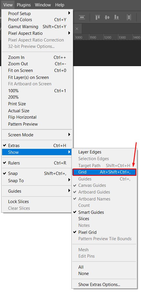 - Go to View > Show > Grid or press Ctrl + ‘ (Cmd + ‘).