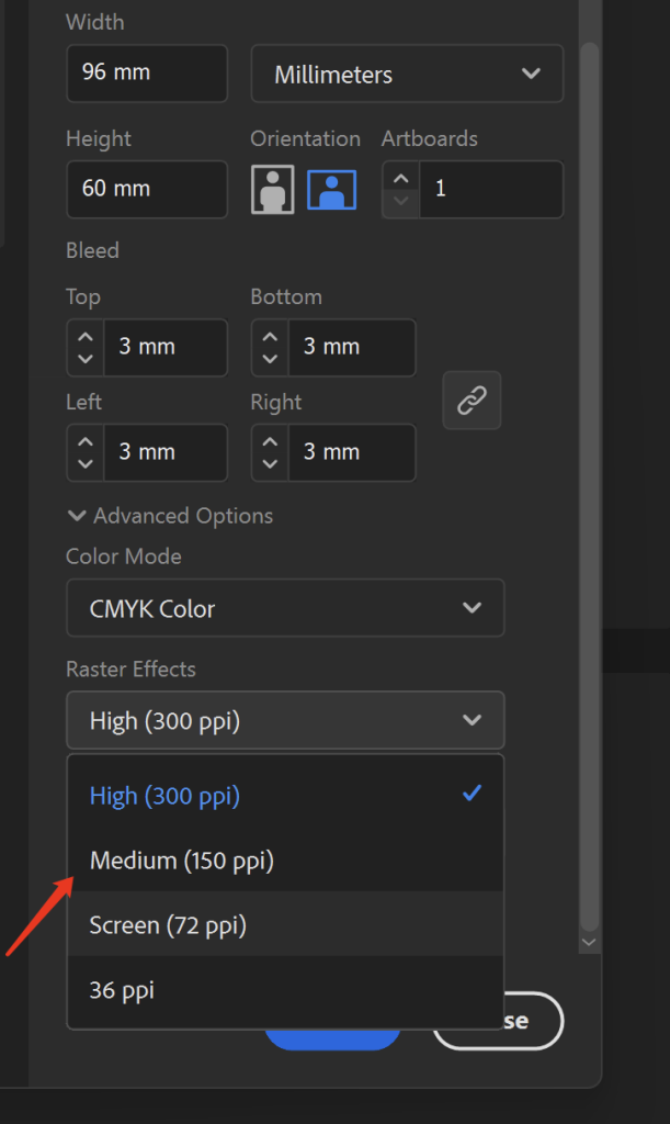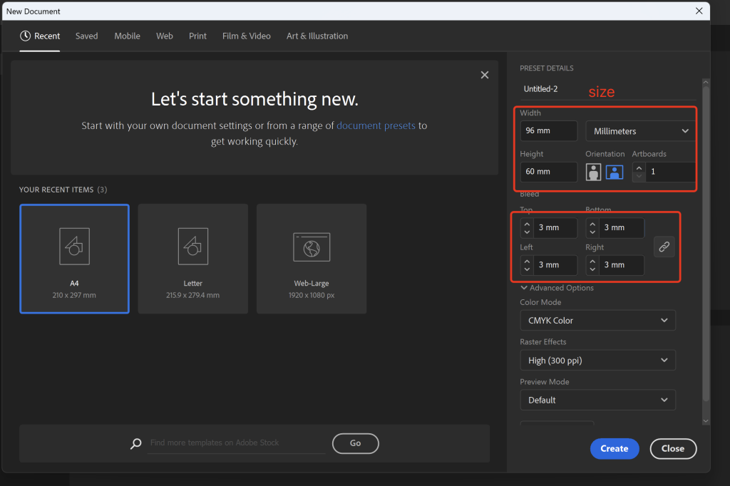 . User defined width and height: enter numbers directly. For example, design business cards are set to 90mm × 54mm (standard size). If you want to print bleeding, you need to add 3mm (that is, 96mm × 60mm). You see, the 3mm is added to prevent the content from being cut off during trimming. It’s very important!